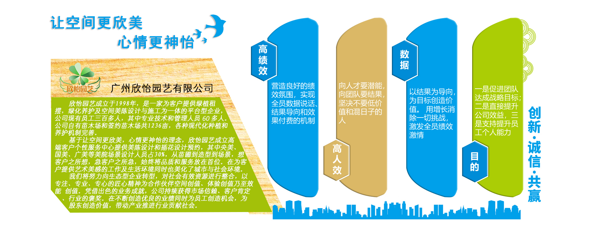 欣怡園藝成立于1998年,是一家為客戶提供綠植租擺,綠化養護及空間美陳設計與施工為一體的平臺型企業,公司現有員工三百多人,其中專業技術和管理人員60多人。公司自有苗木場和簽約苗木場共1236畝,各種現代化種植和養護機制完善。