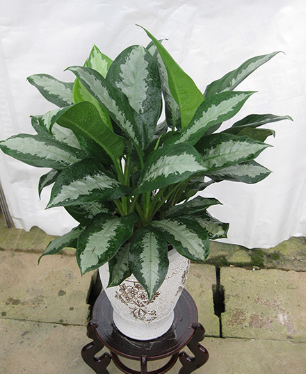 雅麗皇后又名白雪粗肋草、銀河粗肋草。植株直立,葉片披針形,革質(zhì),銳尖,葉深綠色。中肋兩側(cè)具銀灰色大塊條狀斑塊,葉緣與中脈處為暗綠色。本種生長(zhǎng)勢(shì)強(qiáng),易生分枝。耐陰性極強(qiáng)。銀河粗肋草:葉闊披針形,沿中肋有銀灰色寬條斑